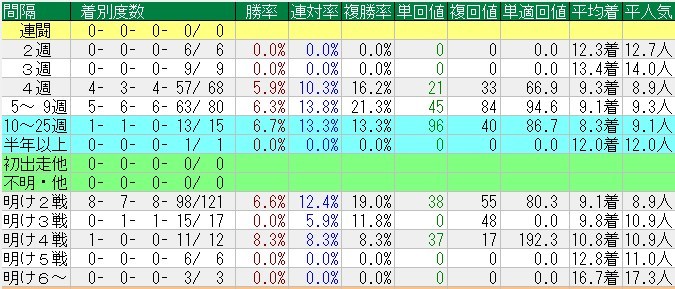 4週(中3週)が滅法強いが、これは全て神戸新聞杯。休み明けは割引材料。ほとんどが明け2戦目。秋華賞はブッツケがトレンドだが、菊花賞は一回叩くのが主流。これは3000mという距離が影響してるのかな?