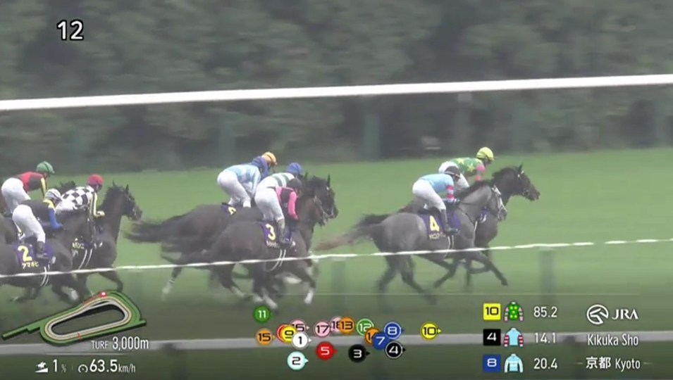 これは坂を下っていくシーンであるが・・・ペースがユルユルの所でポジションを上げ、3コーナーでは脚を溜めたエネルジコに対し・・・ペースがきつくなったところでポジションを上げ、ギアを上げつつエネルジコの後ろに取り付いたエリキング。どちらが勝ったかはご存知の通りだが、今回の勝負はここがポイントだったんじゃないかと思う。