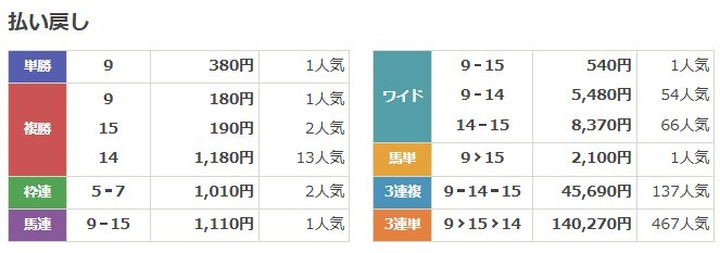 単勝は380円、馬連は1,110円。1番人気と2番人気の組み合わせにしてはオッズついた印象だねー。本命党の中にも不安を感じる人もいたというわけだろう。しかし3着に大穴のエキサイトバイオが入って三連系やワイドは大荒れ!写真判定で歓声が上がっていたが、多くはゲルチュタールの3連系持ってた人の悲鳴だったと思われる。いや、エキサイトバイオは難しかったよなあ~。これを本命にした方は凄すぎる!的中した方の多くもエネルジコかエリキング軸で幅広く買った方じゃないかと思う。