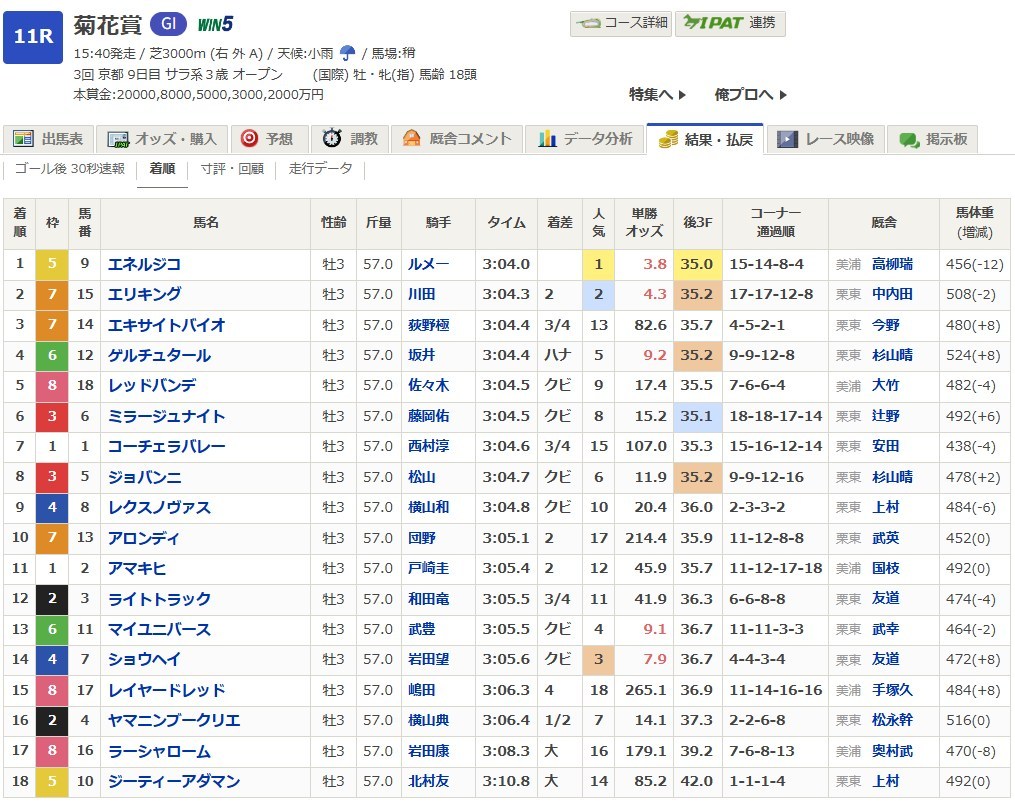 【菊花賞2025レース回顧】京都芝3000mで行われたクラシック最終戦・GⅠ菊花賞!勝ったのはルメール騎乗の1番人気エネルジコ!この馬の勝因は何だったのか?2着エリキングの敗因は?3着には大穴のエキサイトバイオが入ったがこれはフロック?人気の一角だったショウヘイの敗因は?