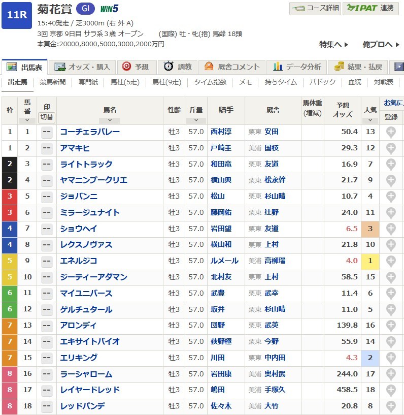まずエネルジコだが、前走時はなかった銭形斑点が浮いており調子は良さそう。ただ、体形的にステイヤーって感じはしないねー。まあ最近の菊花賞は中距離馬でも走れるんだけど。