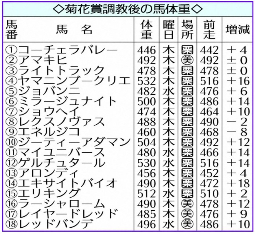 プラス体重の馬が多いねー。エキサイトバイオはやはりちょっと太い?エネルジコは栗東滞在なので輸送がないのは吉だが・・・そこまで大きな馬じゃないだけにマイナス体重は気になるところだねえ。