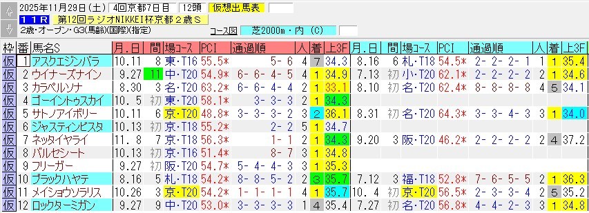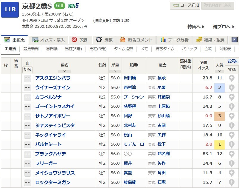 【京都2歳S2025データ分析】京都芝2000mで行われる2歳GⅢ京都2歳ステークス!今年はバルせシート、ウイナーズナイン、サトノアイボリーが人気だが当然大穴狙って逝く!データでは堅い?枠順はフラット?馬体重・騎手・血統・脚質・前走ローテ・上がり3F最速は?穴馬候補はからペルソナ、メイショウソラリス、アスクエジンバラ!