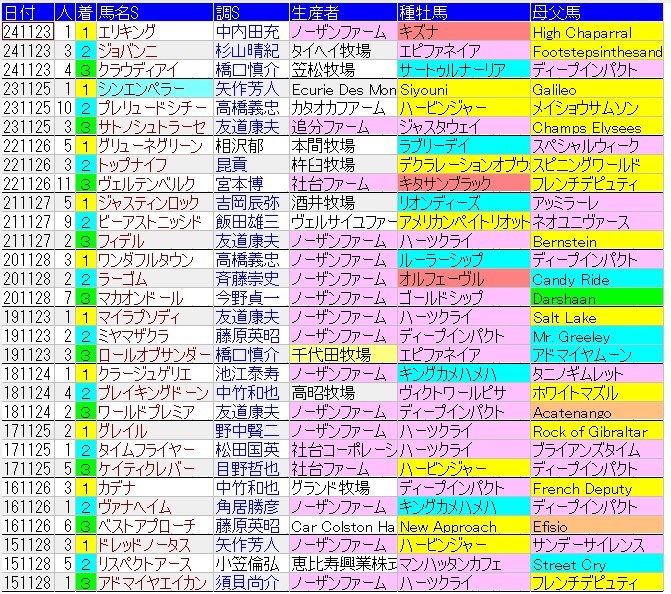 脚質パターンは・・・「差し→差し(追い込み)」「差し→先行」「先行(逃げ)→先行」。前残りになる年もあるが基本は差し系。特に3~4コーナーからポジション上げて行けるような持久力タイプがよく馬券になってるねー。馬場や展開にもよるが、上がりは35秒前後のイメージ。東京のように上がり33秒台の決着になることはまずない。時計は2分1~2秒前後。
