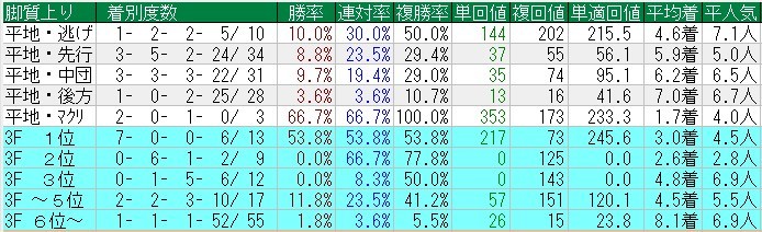 逃げ馬要注意だねー!前後は互角かな。後方待機・マクリが3勝挙げてるのに注目。これを裏付けるように上がり1位が7勝。上がり2位が2着6回、上がり3位が3着5回。なんか上がりの順番そのまま着順になっとる感じだな。