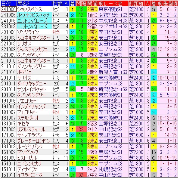 ここ7年は・・・ダービーか安田記念からのローテの馬が1番人気になっててオール連対。ソングラインのみ2着に敗れているが、これは牝馬で57kgを背負ってのもの(牡馬換算で59kg)。トンだのはオークスからのローテだったソウルスターリングのみ。