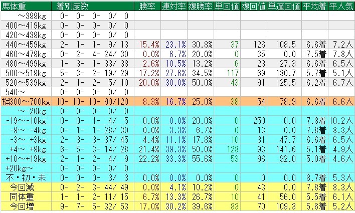 馬体重の最低ラインは440kgだが・・・注目したいのは500kg以上の大型馬。ご覧のようにかなり成績良いんだよね。馬体の増減は・・・馬体増が圧倒的に強い。ココを目標に仕上げた来た馬より、ココをステップに秋のGⅠを狙う!といった実力馬が来るレースだね。