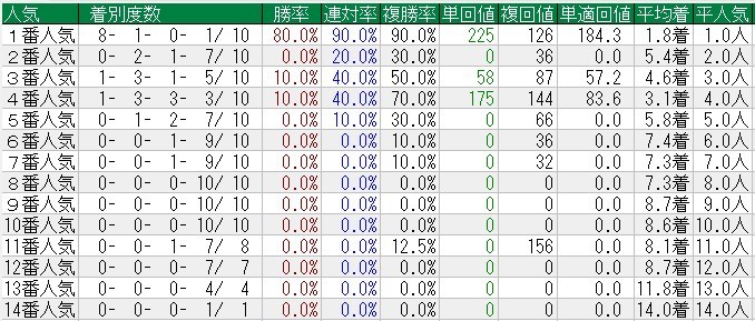 ごえっ!なんだコレ!?1番人気が8勝???こんなに1番人気が強い重賞他にあるか?いや、ない!とんでもなく1番人気が強いレースだね。2番人気はイマイチだが3~4番人気がこれまた馬券にかなり絡んでおり、連対馬の100%が5番人気以内!つまり、1~5番人気の馬連ボックスを買えば当たるレース。それで儲かるかといえばほとんどガミだろうけどw。期待できるのは3着のヒモ荒れ。それも7番人気くらいまで・・・とJRA屈指の堅い重賞と言っていいだろう!