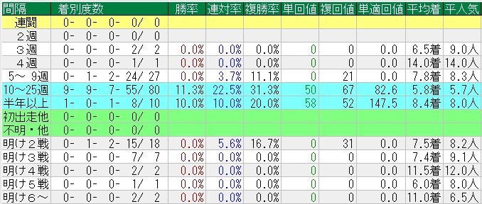 休み明けが鬼強い!というかほとんどが休み明け!間隔詰まってる組はもちろん1~2ヶ月間隔の馬も厳しい。
