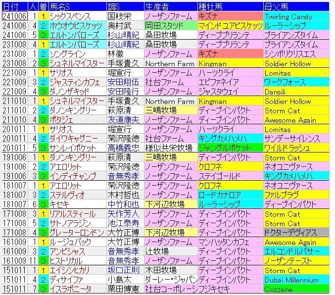 やや関東馬が優勢。社台系強し。特にノーザンF。血統的にはディープインパクトを筆頭にサンデー系が強い。母系ではストームキャットの血に注意。そして・・・リピーター注意!もう毎年のようにリピーターが馬券に絡んでるリピレース!今年も去年の1~3着馬が揃ってるからね(シックスペンス、ホウオウビスケッツ、エルトンバローズ)。要注意だ!