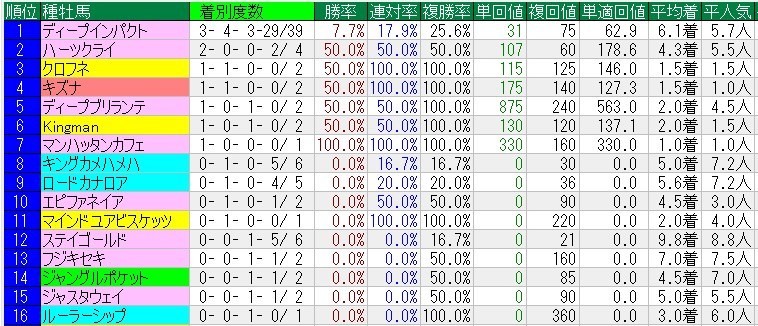 ディープインパクトがかなり馬券に絡むわけだが、分母も多い。東京向きのキレキレ系が強いわけだが、意外とパワー系の血統も来る。