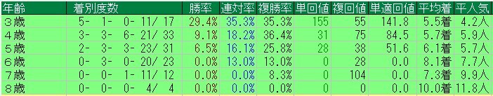 3歳が強い。次いで4歳。5歳もかなり馬券になるが、6歳以上は割引きと言っていいだろう。