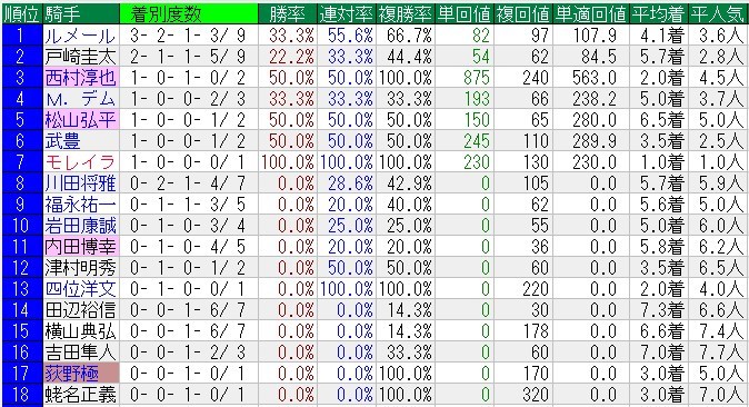 ルメール無双だが・・・今週は不在。戸崎の成績いいね。