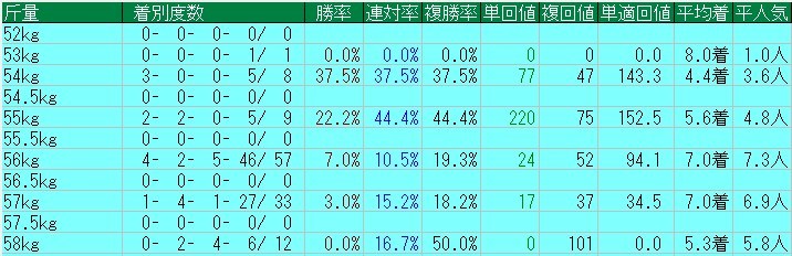 格別定。GⅠ馬だと+2kg。GⅡ勝ってると+1kgのやつね(※3歳馬は2kg減)。基本は56kgだったのだが、一昨年から斤量改定があって57kgに変わってるからね。もうざっくりとしか見ることが出来ないわけだが、注目は58kg。これはGⅠで2kg増、あるいはGⅡ勝ちで1kg増の馬なわけだが、高い確率で馬券に絡むものの勝ち切れていないんだよね。頭で来るのは54kg、それから55kg。これらは3歳馬や牝馬なわけだが、やはり狙い目としてはこの辺ですな(今年で言えば55kg、56kg)。