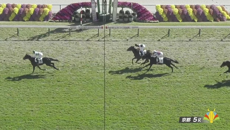 今日の5Rは芝2000m内回りの2歳新馬戦。600mは36.8、1000mは61.5。新馬戦らしくゆったりしたペースで、上がりは35.4。時計は2:01.9。勝ったのは北村友一騎乗のアクセス。後方待機から京都禁断の3コーナー手前からの仕掛け。それで先団に取り付き、直線突き抜けて圧勝。とんでもない能力を秘めた馬だねー。2着は2番手から粘った武豊ロングトールサリー。3着も前々からしぶとく脚を伸ばしたレーンのジュンプリメーロ。このレースは内の荒れたところを避けてた模様。やっぱり内はちょっと悪いのか?