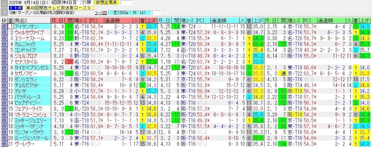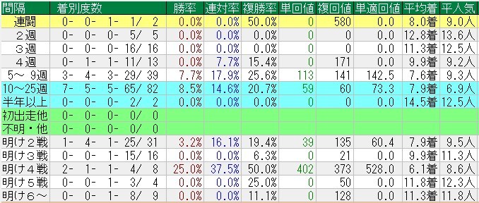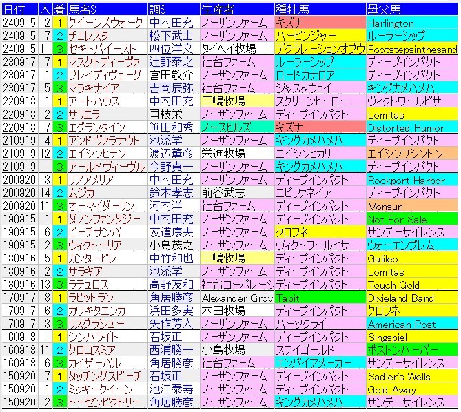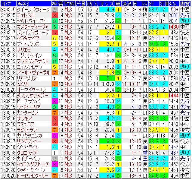 秋華賞の前哨戦なんでね。休み明けでも何ら問題ないというか基本は休み明けの馬を狙うレース。夏の上がり馬を狙う場合も4週(中3週)以下の馬は劣勢なんでね。1ヶ月以上の間隔でゆったりローテの馬の方がいい。この点で気になるのはタガノアビー。今回中3週なんだよねえ。