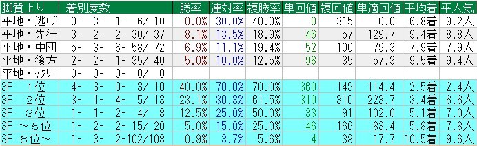 阪神芝1800mはJRAでも屈指の瞬発力コース。このレースも差し・追い込み馬が強く、上がり1~2位は猛烈に強い。速い上がり必須のレースだ。