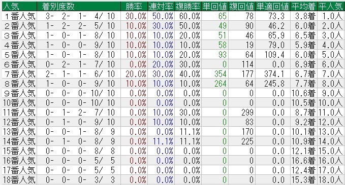 1番人気の強さは標準的。以下の人気サイドも標準的で7~8番人気が3勝。2~3着のヒモ荒れ頻度も十分。堅い時もあれば荒れる時もあるレースだね。1番人気は強いが、イメージより荒れる重賞と考えていいだろう。