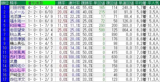 川田、ルメール、池添注意。まあ、関西の上位騎手だね。
