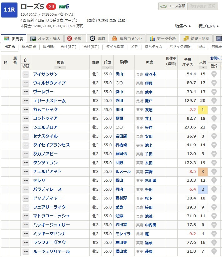 タガノアビーは前走2勝クラスを取りこぼしたが、オークス3着馬。そのオークスではこの馬の激走で三連単を取り逃がしたんでね。買うかどうかは置いておいてマークはしっかりしておきたい。あとは1勝クラスに大物がいるかどうかだねー。