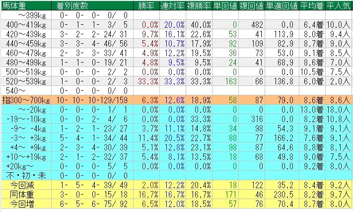 秋の3歳牝馬限定戦。最低ラインは400kgだが420kgは欲しいところ。大き過ぎても良くなく・・・480kg以上は割引材料。馬体の増減は「馬体増」が優勢。二桁増でも問題なし。やはり馬体の成長は欲しいところだね。