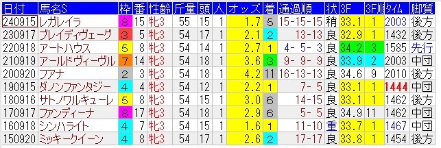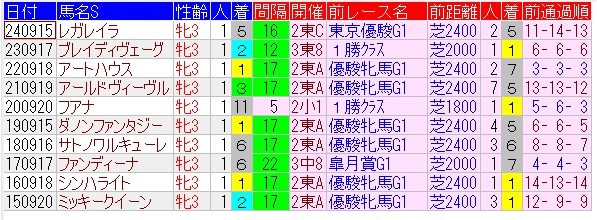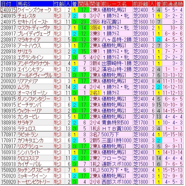 本番の前に一叩きというのが常識だった以前はね。オークス上位馬の多くがこのレースに出走していたものだが、最近は秋華賞直行というローテを取ることが多く、特にオークス馬がこのレースに出走する機会は激減したわけだが、ミッキークイーン・シンハライトの2頭がオークス1着からのローテで連対してますな。他の1番人気を見ても、やはりオークスからのローテは信頼度高し。