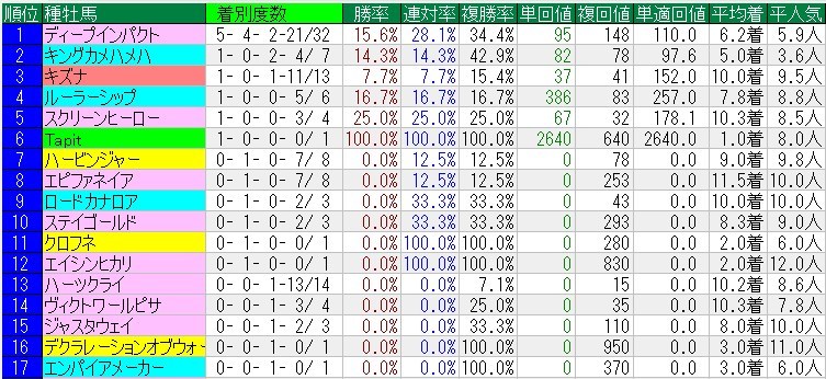 ディープインパクトの数字が凄いことになっているが、もうこの世代にはいないんだよね。しかしディープインパクトの血を持つ馬には注意が必要だ。