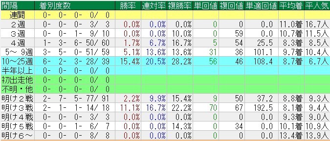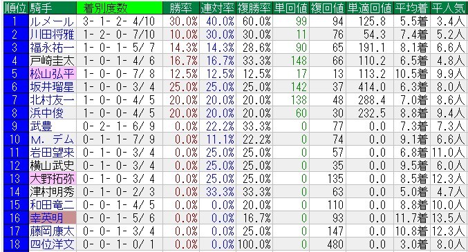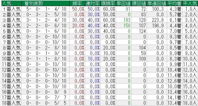 コーナー4つの内回り戦。さぞかし内がいいのだろうと思いきや・・・ご覧の通り内枠はイマイチな成績。外が良いという話ではないが、内枠に入ったから買い!という訳ではないのは覚えておきたい。
