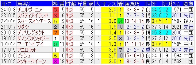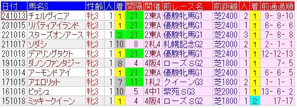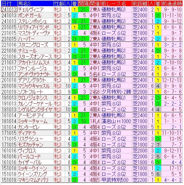 注目ローテは・・・オークス(10頭)、ローズS(9頭)、紫苑S(8頭)。この3つで9割を占める。マレに2勝クラスから馬券になる馬もいるが、これはレアケースだ。傾向としては・・・以前はローズS組が強かったが、ココ数年はもうオークスからの直行組が圧倒的に強く、頭はオークスからの直行組。2~3着はオークス組orローズS組or紫苑S組という感じになっている。そのオークス組だが馬券になるのは3着以内!これは例外ナシ。つまりブッツケで結果を出してるのはオークス上位馬限定ということ。惨敗からのブッツケで巻き返した例はない。ローズS組は5着以内くらいに入っておけば資格あり。紫苑Sも同じく掲示板以内としたい。ここで3~5着くらいに負けてる馬が穴候補。