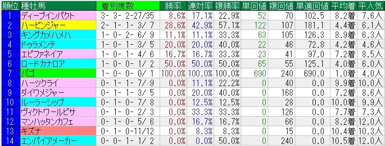 もうこの世代にディープインパクト産駒はいないのでね。これを除くと・・・相性いいのはハービンジャー。それからキングカメハメハ系(ドゥラメンテ、ロードカナロア、ルーラーシップ)。ディープインパクトの後継キズナは相性悪そうだね。