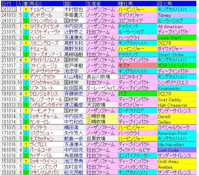 関西馬優勢。リーディング上位の有名厩舎が強い。社台系鬼強。ここ4年は1~3着馬独占。血統的には・・・上でキングカメハメハ系が相性良いと書いたが、これは母父に入っても有効。