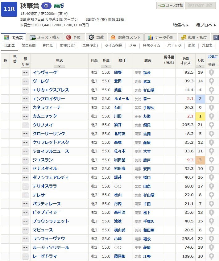 さすがGⅠという感じでルメール、川田、武豊、戸崎などの最上位騎手が来てますなあ。