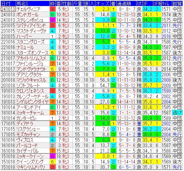 コーナー4つの内回り戦なんでね。さぞかし前が有利だろうと思ってしまうわけだが、現実は逆!ご覧の通り、差し・追い込み勢が強いのである。これは秋華賞が「魔の秋華賞ペース」になる(毎年速いペースになる)ことが原因。内回りのフルゲートでポジション争いが激しくなりやすい上に、マイラー的な馬も多数出走するレースなんでね。どうしてもペースは速くなりやすいのである。当然上がり上位馬が強い。ただ、前が残らないわけではないので注意が必要。