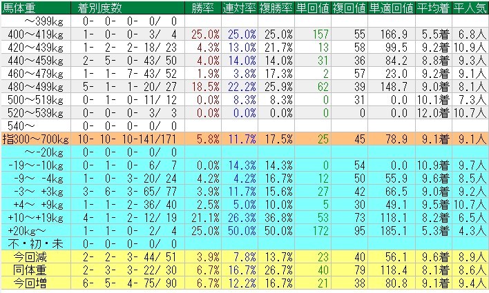 馬格はあまり気にしなくていい。むしろ500kg以上の大型牝馬は割引のデータ。一応の最低ラインは420kg。馬体の増減は圧倒的に馬体増が優勢。二桁増だとさらに激アツ。
