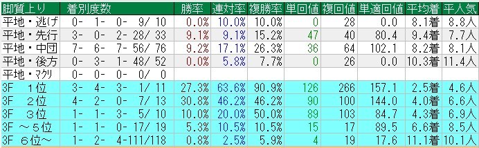 脚質パターンは・・・「差し→差し(追い込み)」「先行→差し」。ご覧のように差し馬だらけ。逃げて馬券になったのはミッキーチャームだけ。2~3番手の馬も壊滅。先行といっても5~6番手の「中団前目」のタイプなら買える感じだね。