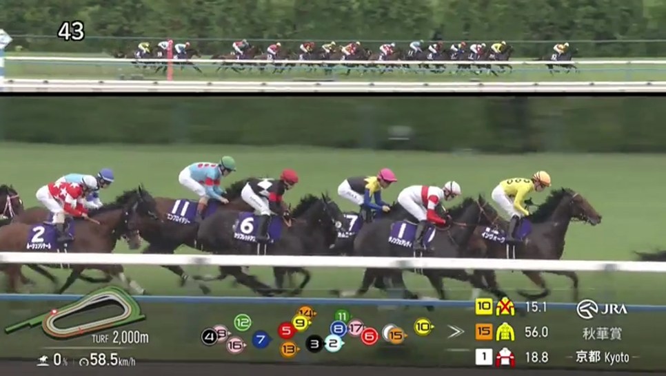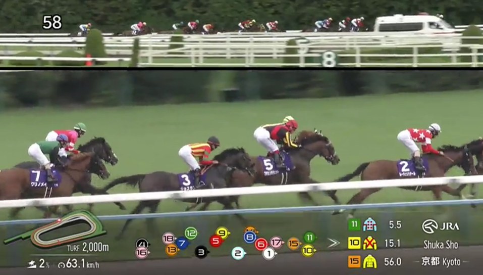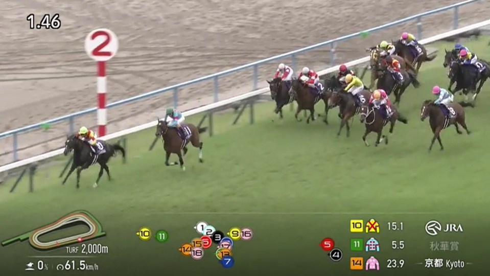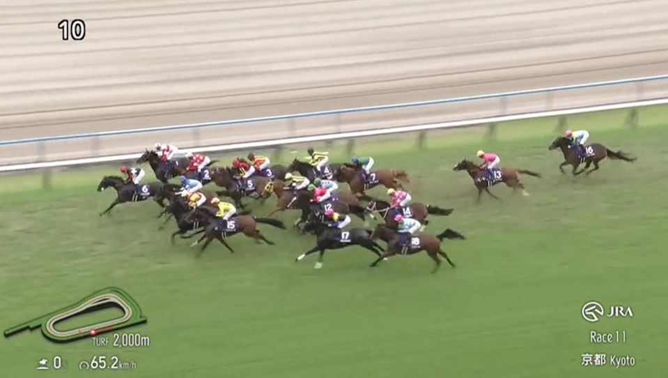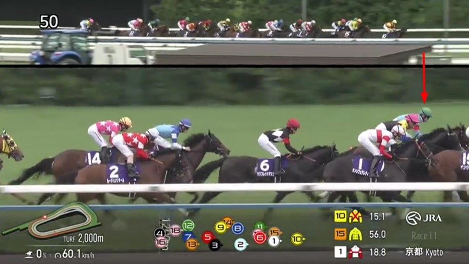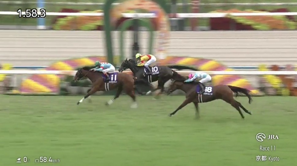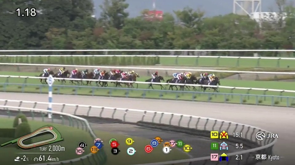 そして・・・向こう正面に入ったこのタイミングでルメール・エンブロイダリーが動く!カムニャックを交わし、2番手まで上昇するのだ!京都は向こう正面半ばから3コーナーに掛けて激しい上りだからねー。動くなら上りに掛かる前のココ!というのはわからんでもないが、実際にココで動く馬はほとんど見かけない!動けば掛かる可能性があるのであり、勢いが付いたまま坂を登ることになるからだ。この辺はルメールの凄みだわな。