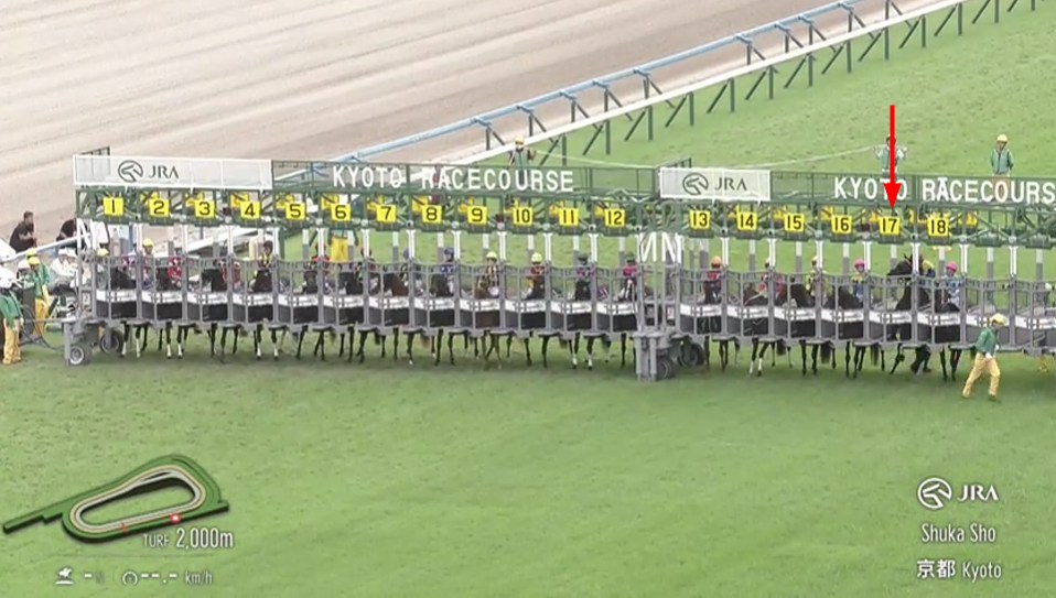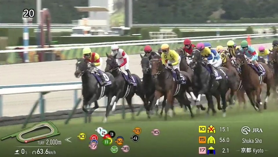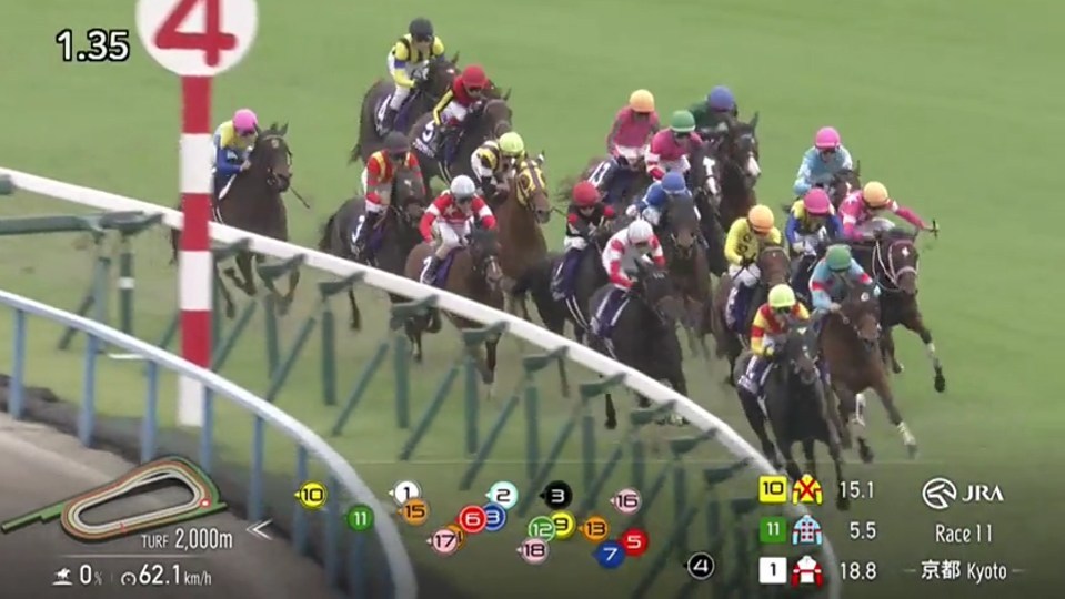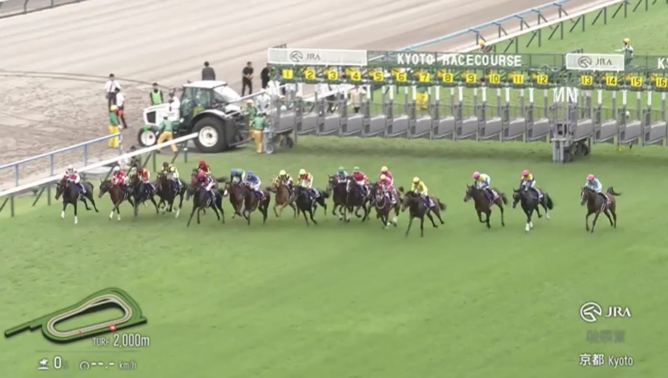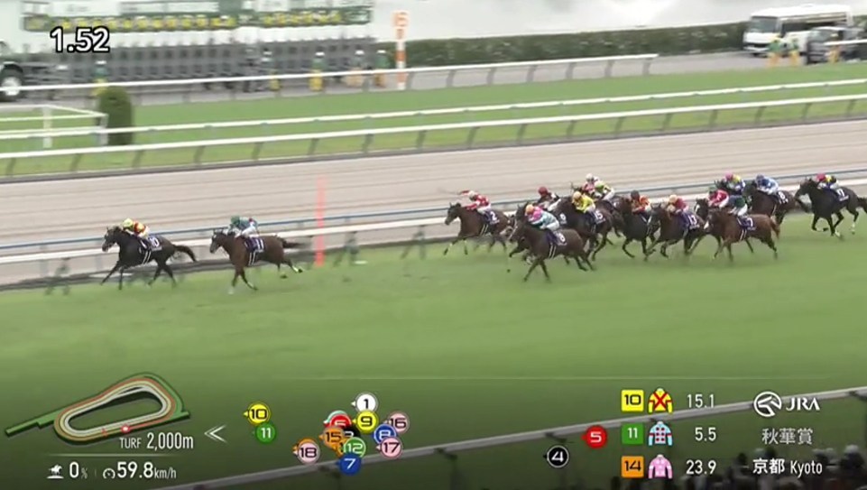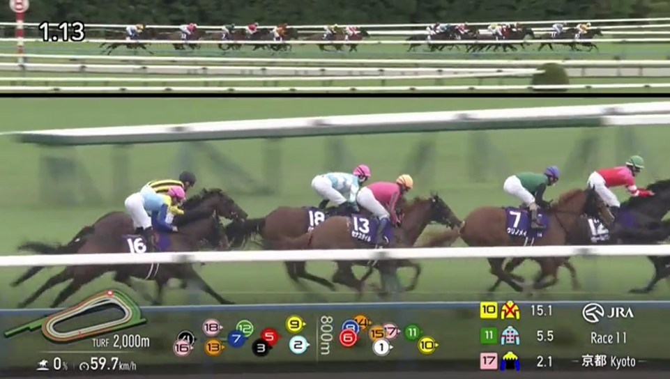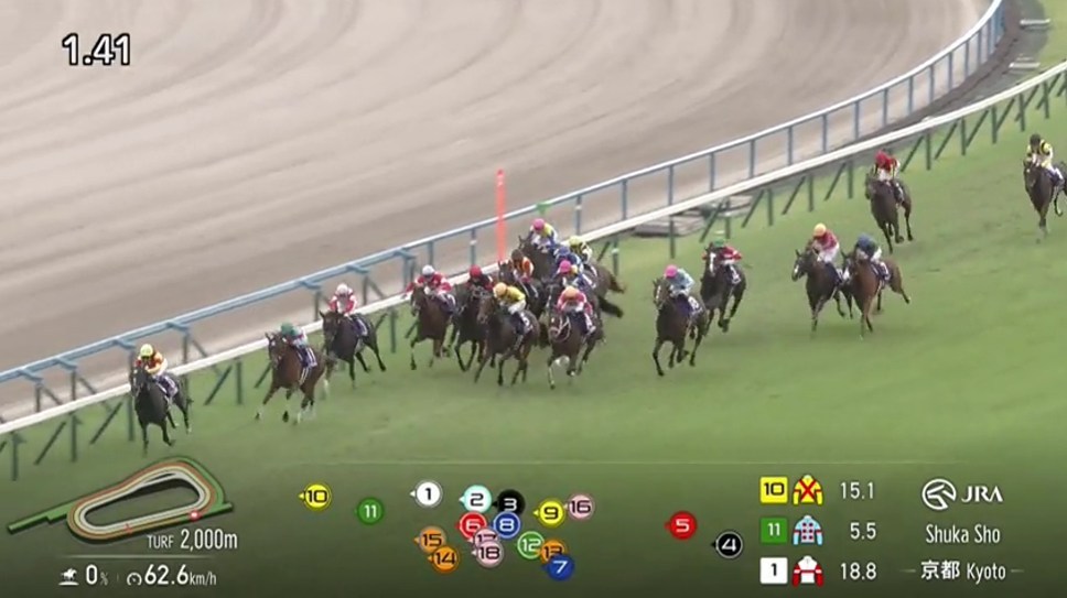 そして・・・向こう正面に入ったこのタイミングでルメール・エンブロイダリーが動く!カムニャックを交わし、2番手まで上昇するのだ!京都は向こう正面半ばから3コーナーに掛けて激しい上りだからねー。動くなら上りに掛かる前のココ!というのはわからんでもないが、実際にココで動く馬はほとんど見かけない!動けば掛かる可能性があるのであり、勢いが付いたまま坂を登ることになるからだ。この辺はルメールの凄みだわな。