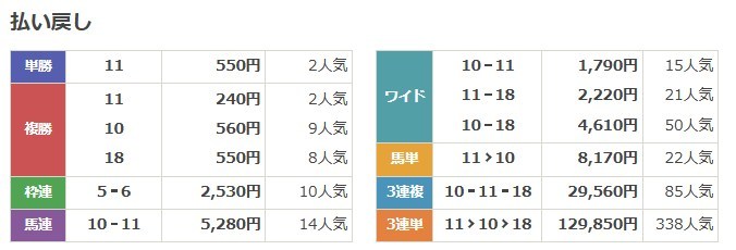 2番人気→5番人気→6番人気の組み合わせで馬連5,280円。これは結構付いた感があるが、複勝を見るとエリカエクスプレスは9番人気だったのね。つまり、単勝は売れてたけど、連系ではあまり売れてなかったわけだ。三連複は29,560円。これは妥当な気がするねー。もうちょい付いてもいいか。