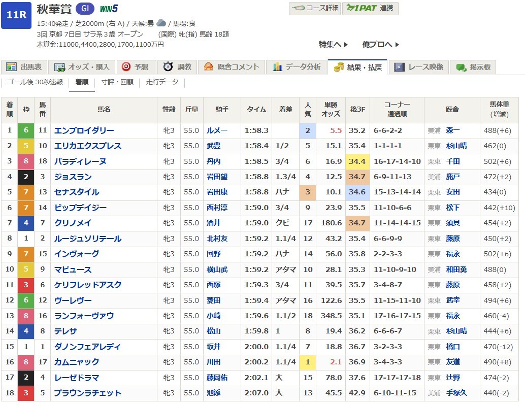 勝ったエンブロイダリーはノーザンF生産のアドマイヤマーズ産駒。美浦・森厩舎。鞍上はルメール。個人的にはね。オークスの敗因は距離よりも「引っ掛かったから」だと考えてたからね。秋華賞は人気落とすなら面白い!とオークスのレース回顧でも書いてたんだが、蓋を開ければルメール騎乗でやっぱり人気。それに、一度掛かった馬は再び掛かることも多いし、やはりアドマイヤマーズ産駒の2000mというのはイメージが湧かず(これまで2000m以上を勝ったのは2頭のみ。牝馬では初めて)、もう来たらごめんちゃいでぶった斬ったわけだが、ワタスが間違ってました。強かったし、距離も全然問題なかったれす。というのも、間違いなく今回一番強い競馬をしたのはこの馬。前半の向こう正面で脚を使い、全体のペースを上げつつ息を入れ、直線もただ一頭エリカエクスプレスを追いかけ、キッチリ交わしつつ後続も完封したのだから強いの一言。ペース耐性の高い馬でね。弱点はオークスのように道中のペースが緩むパターンだろう。個人的には2200も持つと思うんでね。次は是非ともエリザベス女王杯に出てきて頂きたい。まあでもルメールに先約がある場合はスルーになっちゃうかな?