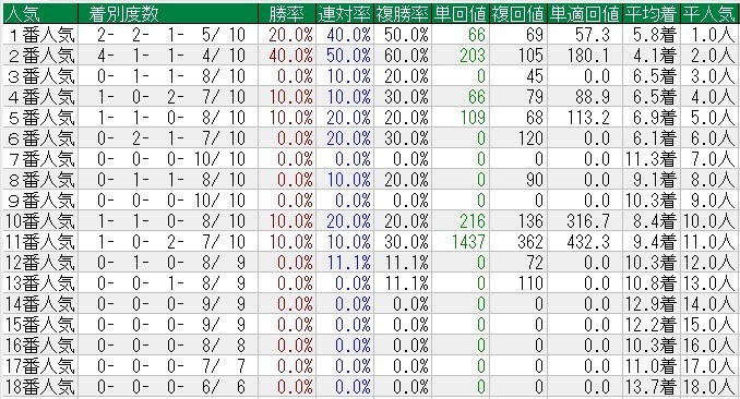 1番人気は平均よりやや落ちるが、2番人気が強いね。3~4番人気はイマイチで・・・全体的に人気サイドの成績はそこそこ。10番人気、11番人気の勝利があるように頭が荒れることもあるし、2~3着ヒモ荒れのケースも十分期待出来るレース。二桁人気は過去10年で7頭馬券に絡んでおり、大穴狙いもオッケーだ!