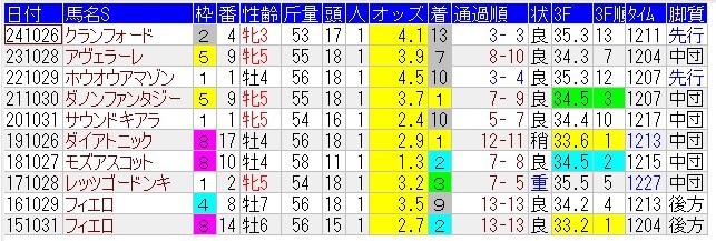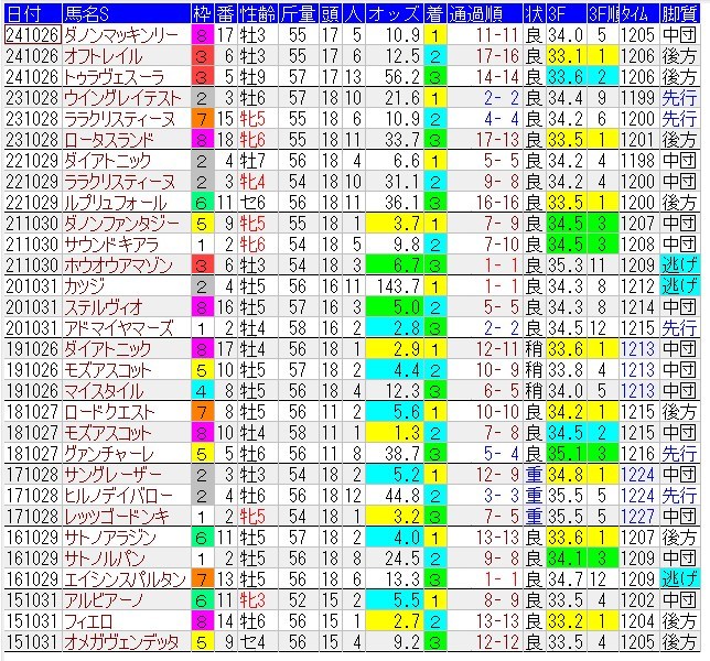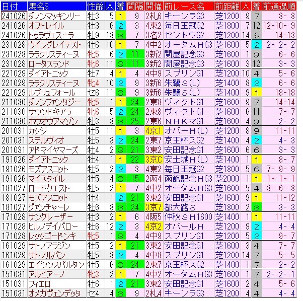 例年だと10月の最終週に行われていたんだが、今年から繰り上がって10月2週の施行に変更。いつもJRAには文句ばっかり言ってるが、この変更はナイスだと思う。これまでは本番のマイルCSまで中2週だったが、これである程度余裕を持ったローテになるからね。というわけで若干傾向が変わるかもだが(本番を見据えて叩き台に使う馬が増えるはず)。休み明けでも全く問題ナシ。1~2ヶ月のローテも優秀。ここを目標に仕上げてきた馬も馬券に絡む。