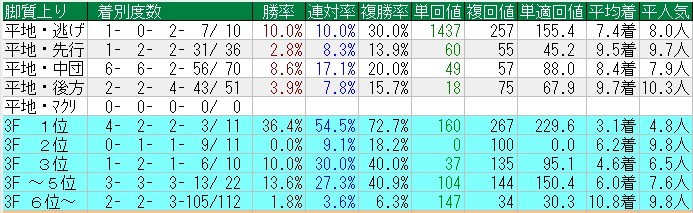 強いのは差し・追い込みだが、前も穴を開けるので注意が必要。カツジみたいな逃げ馬にも要警戒。