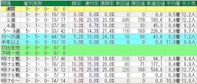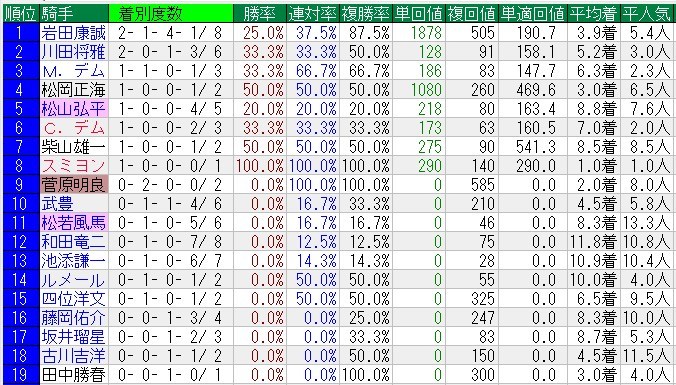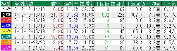 2枠の成績が良いねー。ただ内が良いというわけではなく、大外枠も結構馬券に絡む。内外フラットと見て良さそう。