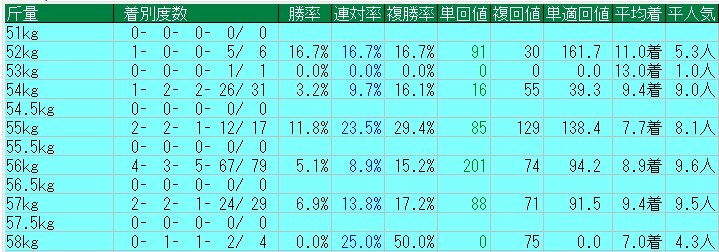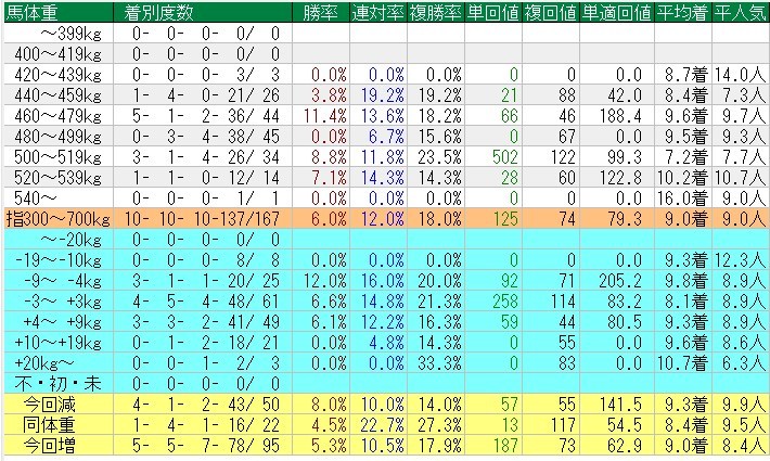 最低ラインは440kg。500kg以上の大型馬はプラス。馬体の増減は互角。どっちかと言うと馬体増が優勢。