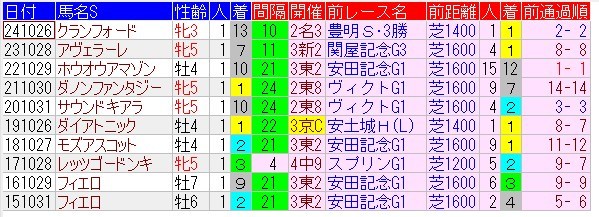 注目ローテは・・・安田記念(4頭)、スプリンターズS(3頭)、京成杯AH(3頭)、あとはバラバラ。あ、スプリンターズSや毎日王冠といったローテは間隔が狭くなるので今後厳しくなりそうだね。逆に増えて来そうなのが京成杯AHやセントウルSからのローテ。構図としては、春のGⅠ組vs夏の上がり馬という感じでオッケー。前走距離は1200~1600m。前走GⅠなら着順不問。他GⅡ~GⅢは好走してる方が望ましいが、惨敗からの巻き返しも普通にある。オープン特別は好走条件。準オープンは厳しい。