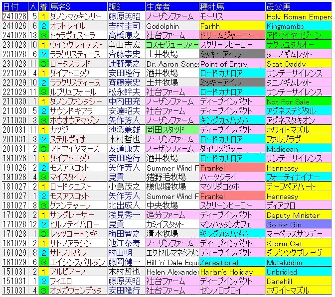 関西馬が圧倒的に優勢。関東馬は過去10年で4頭しか馬券になっていない。意外にも社台系はイマイチ。来る時は来るが来ない時は全く来ない。血統的には近年はもうディープインパクトかロードカナロアかという感じになってるんだが去年は該当せず。スクリーンヒーロー~モーリスのラインにも注意。ああ、去年はトゥラヴェスーラに◎打って悶絶したんだっけwww。