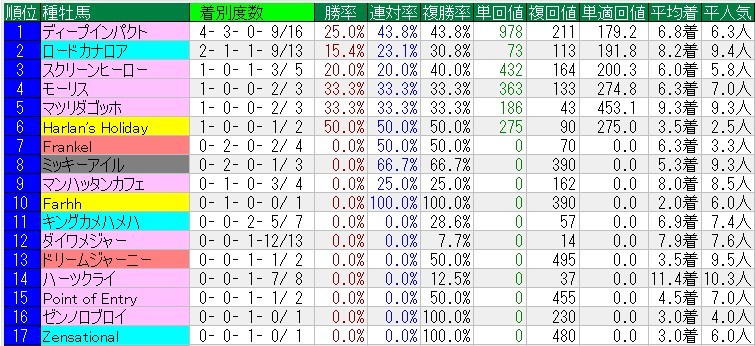 脚質パターンは・・・「差し→差し(追い込み)」「先行(逃げ)→先行」。5~6番手の馬が「差し」に分類されることがあるんでね。上の数字ほど差しが強いわけではないが、馬券パターンの多くが差し追い込み決着。もちろん一昨年のように前決着の年もあるのだが、もう「差し決着決め打ち」でもいいかもしれんね。