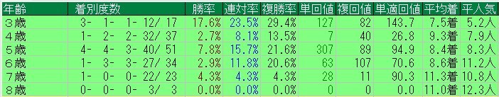 5歳がもっとも馬券に絡む。率で言えば3歳。4歳はイマイチ。むしろ6歳の方が買い。