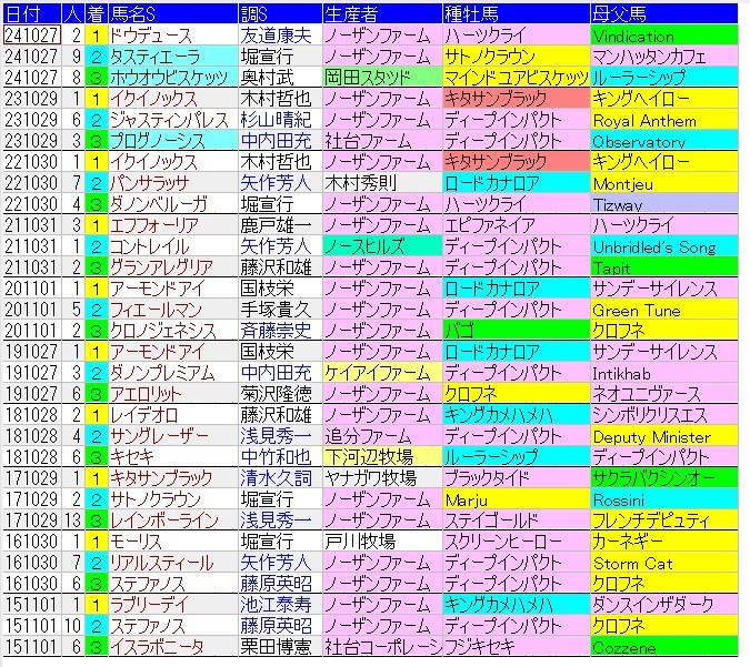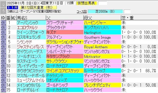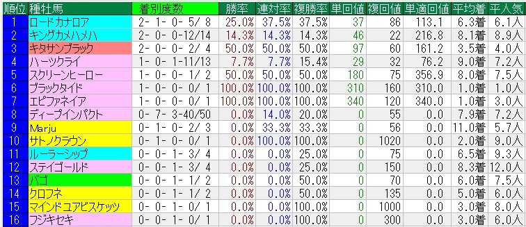 ロードカナロアの2勝はいずれもアーモンドアイ。それからキタサンブラックの2勝はイクイノックス。まあ普通にサンデーサイレンスかキングカメハメハが有力。面白いのはディープインパクトの成績【0.7.3.40】。今年のディープインパクト産駒はジャスティンパレスだけだが・・・この馬の2着固定とか面白いかもね。