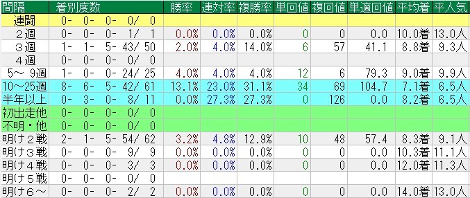 休み明けOK。というか今やそれが主流。天皇賞の前に一つ叩くというのはもう過去の話になりつつある。間隔詰まってる組では3週(中2週)が結構馬券になっているが、これはほとんどが毎日王冠。しかしここ5年で見ると1頭しか馬券になっておらず(去年のホウオウビスケッツ)、間隔詰まってる馬は割引で考えていいかもしれない。